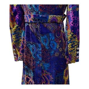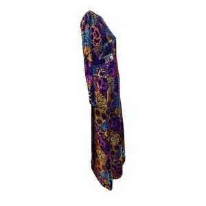 Vintage Vogue Paris Collection empire waist gown with long sleeves with three glittery rhinestone buttons at each cuff made of velvety material covered in gorgeous bursts of bold blue, pink, yellow and red floral pattern. A velvety belt wraps across the back waist joined by sparkling faux diamond rhinestone buttons at either side of hip. Fully lined in blue silky fabric with back zip hook and eye closure.