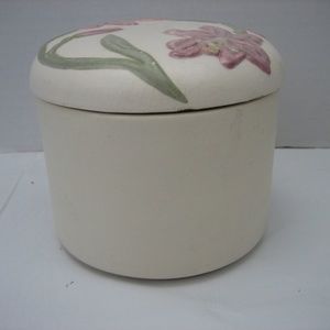 An adorable gently used trinket box in good condition with the following wear: (1) a smudged spot on the lid (see photos No.3,. 8) (2) Three chips on the edge of the lid( photo No.9 (3) a few very tiny pricked areas on the upper lid floral pattern.(photo No. 2). (4) Minor scratch wear overall.