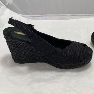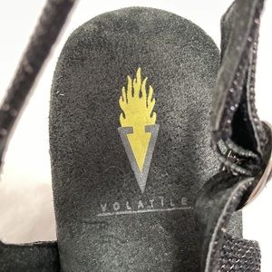 Beautiful Volatile wedges with black metallic fabric upper. Side pewter buckle, elasticized strap, criss cross front, open toe. Black straw wrapped wedge heel and platform bed. Heel measures approx 4", platform approx 1". Cushioned footbed. Very lightweight. Size 10M. Gently worn with minimal wear. Does not include box.
