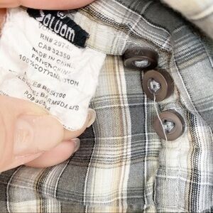 VOLCOM Mens BARMUDA Classic Plaid Pocket Long Sleeve Button Down Shirt Green Brown Large. Very good Pre-owned condition. Gentle signs of wear. No stains or holes.