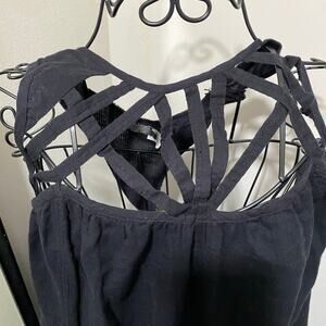 VOLCOM black cotton dress / coverup with lattice work yoke detail and embroidered racerback. Cotton lining. Elasticized around the back.
