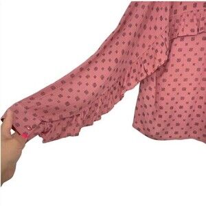 New with tags is this awesome top in a vintage mauve color. Crinkled and lightweight. A Boxy oversized fit. Long Sleeves with a ruffle that follows across the other sleeve. Chic Boho, cowgirl Vibes!!