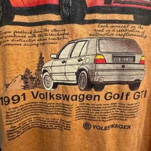 Official product of Volkswagen! Acid wash, crew neck, short sleeve t-shirt. It features the VW logo on the front and graphics of the iconic 1991 Volkswagen Golf GTI. The perfect tee for vintage car lovers!