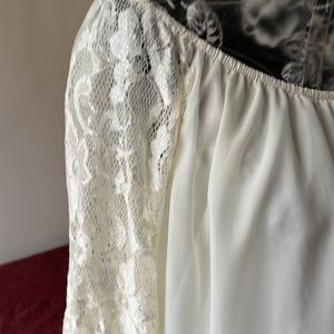 VOLL size large Ivory off shoulder lined dress with lace sleeve bell sleeve