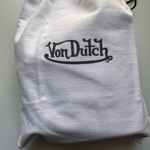 Eye-catching satchel with pink leopard print. Features bold Von Dutch logo. Perfect for a trendy look.