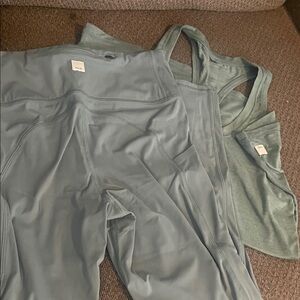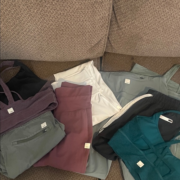 A collection of activewear including tops and leggings in various colors. Perfect for workouts.