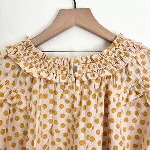 VOY Anthropologie cream and mustard yellow polka dot top. This is a really beautiful shirt with the cutest ruffle collar that goes around the neck. Also has adorable oversized flutter sleeves. The perfect top for layering in the cooler months. Excellent condition, size small (a bit oversized and would fit a medium as well)
