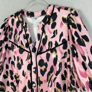 VOY size L pink leopard drop waist ruffle dress short puff sleeve button front