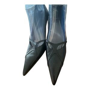 The VOZ EUC Women's Black Pumps in size 9M are a luxurious and elegant choice for career and formal occasions. Made with faux snakeskin and featuring a pointed toe and stiletto heel, these pumps exude a mature and sophisticated vibe. Perfect for workwear or parties, these slip-on heels are a stylish and versatile addition to any woman's shoe collection. Made with leather outsole and fabric insole, these pumps offer both comfort and durability, making them a timeless choice for any season.