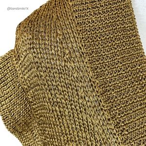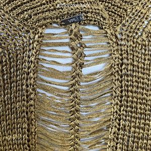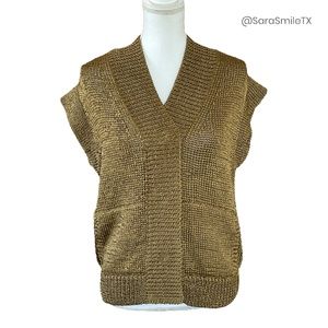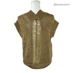 VPL metallic gold chunky knit short cap sleeve cardigan sweater. Chunky knit with braided, open weave detailing down the back. Heavy, slightly shiny woven thread. Double slit pockets. V-neck. Snap closure. UNIQUE & HARD TO FIND! Excellent used condition. No holes or stains. Fabric: 100% polyester. Measurements (approx/laying flat): 21“ bust, 20“ waist, 16“ hip, 4“ sleeve, 23“ length. Size Small. Retail $425.