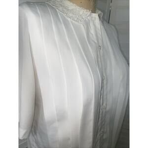 Shirt sleeves. Full button front. Lightweight shoulder pads. Delicate lace collar. Pleated front.