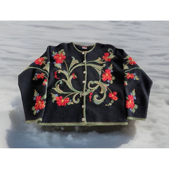 VRIKKE All Over Embroidered Wool Cardigan Sweater Norwegian Irene Haugland Ladies Large