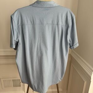 Elevate your wardrobe with this stylish light blue men's short sleeve button down shirt. Perfect for any occasion, this shirt offers both comfort and elegance. EUC, size Large.