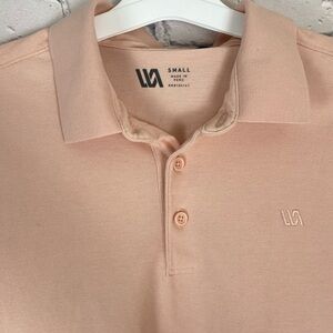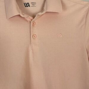 VRST mens polo shirt size small. This polo is made of traditional woven cotton material in a peach color. Great for casual wear or to work.