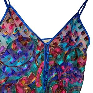 Victoria's Secret Gold Label semi-sheer teddy bodysuit with a floral and paisley print in jewel tones of blue, pink, and green