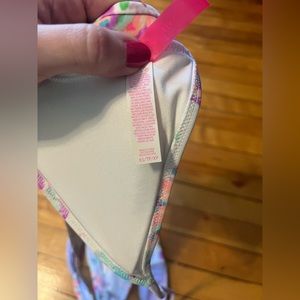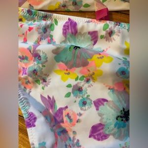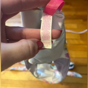This previously loved set has been with me for quite some time but is still in excellent condition. The bottoms are a size small (fits like an XS) and the top is an xsmall. Has removable breast pads and adjustable tie straps. The bottoms fit nicely around the bum without creeping or constant adjustment. Would rather keep as a set.