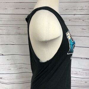Lightly worn but in good condition. Black tank top with tropical print. Muscle style tank top with deep cut arm holes.