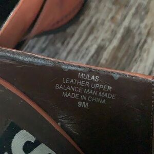 Chestnut colored leather mules with 3 1/2” block heel. Elastic gussets, brass buckle, square toe, & hand stitched detail around edges. Leather upper & man made sole. Preloved but a lot of life left. Light wear to soles, there is about a 1/2” scrape on the inner edge of sole on left shoe. Lining is peeling on upper edges, and the insole is raising down by the toes. Natural variations in the leather. There is some light creasing and some scratches here and there. Mainly in the heels. See pics.