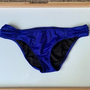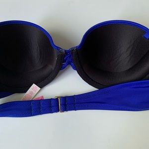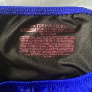 Victoria’s Secret cobalt blue bikini set. Bottoms are “Knockout Bikini,” size M. Top is a push-up bra style, size 32B. Bottoms have never been worn and top has been worn once (a little bit of fraying as seen in the last two photos). Top bought for around $40 and bottoms for around $35 (~$75 all together). So flattering!