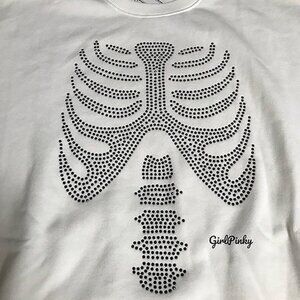 VS PINK BLING HALLOWEEN 2024 EDITION CREW SWEATSHIRT IN WHITE & BLACK SKELETON RHINESTONES.