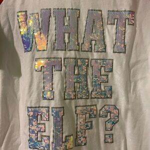 NWT and no defects. Size oversized X-small(will fit up to medium and most smaller large). White with red. Silver bling and Writeout on arms and iridescent bling writing “What The Elf” on the front. Super cute, sparkly and fun! Armpit to armpit 20 1/2” and centerback length 28 1/2”. Price firm. Tote 18.