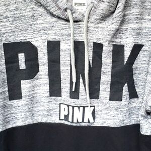 Soft lightweight summer terry heathered gray and black long sleeve colorblock hoodie from Pink by Victoria’s Secret. Women’s size XS. Gray area in front has “PINK” in black lettering, and again in white lettering right below.
