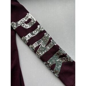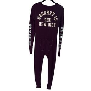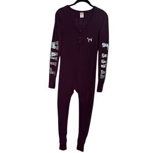 Great condition Victoria's Secret Pink Bling Thermal Long Jane Naughty is the New Nice One Piece pajama. Burgundy purple color. Women's size small.