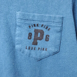 Victoria's Secret VS PINK blue long sleeve pocket pullover sweatshirt. Long sleeves. Pullover styling. Chest pocket with Love Pink 86 graphic.