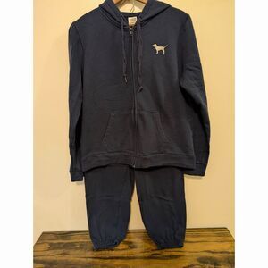 Three complete VS PINK matching sets! Bundle of cozy loungewear in good-excellent pre-owned condition. Includes: Red & Gold Glitter Set: L/M. Navy & Gold Bling Set: L/S. Gray Stripe Set: L/L.