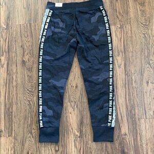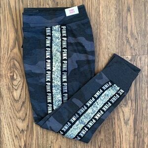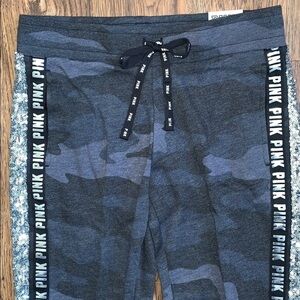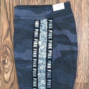 Camo with silver sequin bling. Slim tapered fit, side pockets, elastic drawstring waistband. Materials are 60% cotton /40% polyester.
