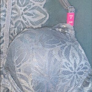 Perfect push plus lots of lace. Has plunging neckline with easy front clasp closure. Adjustable straps. Blue with a bit of shimmer.