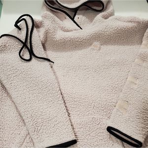 Blush color, logo down the arm. Only worn a few times. String came out and I can't get it back in. Drawstring at the bottom. Oversized fit.