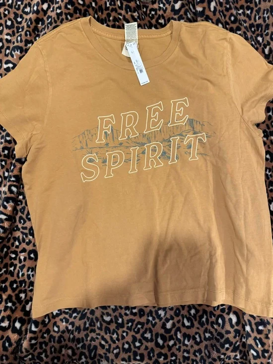 Casual womens VS PINK tee in a warm mustard color with a bold "FREE SPIRIT" graphic. Comfortable cotton feel and a relaxed fit for everyday wear. Easy to style with jeans or shorts for a laid-back look. Size Large NWT never worn