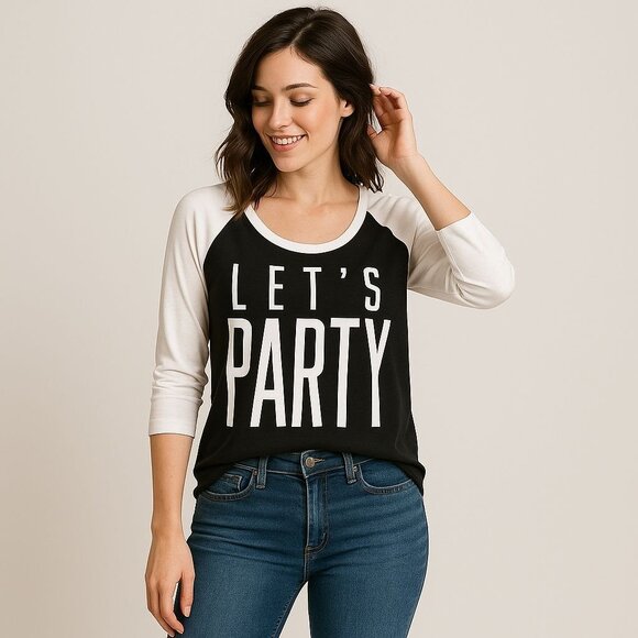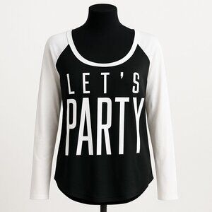 What: Long sleeve lightweight thin graphic tee with “LET’S PARTY” slogan