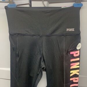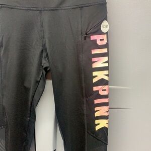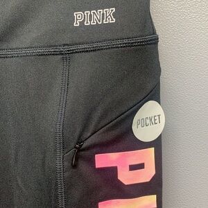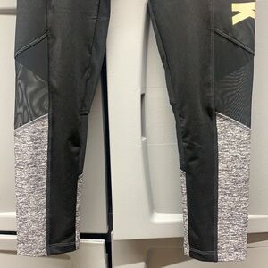 Black leggings with black mesh, marled grey and pink/yellow lettering. Front zip pockets 4-way stretch Sweat wicking Breathable Quick dry fabric Approximate Flat Lay Measurements: 12" across waist 22" inseam