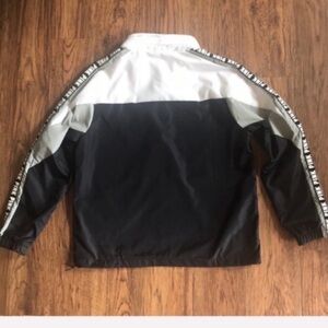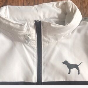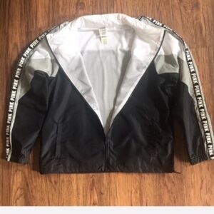 Black, white and grey light jacket. PINK logo on sleeves. Material is 100% polyester. Measures approximately 21" across chest and 26" from shoulder to hem. Has two front pockets, zipped hood. Pull toggle on bottom so you can tighten if needed.