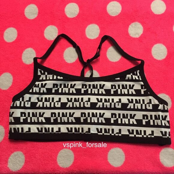New in online packaging. Size large. Black and white color. PINK logo stripe pattern on front. Adjustable Racerback straps. Strappy on back.