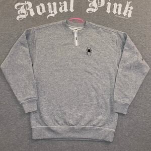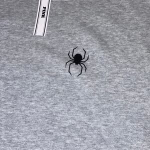 Gray ivy fleece long sleeve pullover crewneck sweatshirt with a black widow spider on the front left chest. A big PINK logo on the back in black with spider webs. So cute!