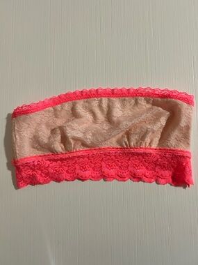 Color is hot pink - back is see-through lace; it is lightly lined and has cute silver logo heart in middle of back.