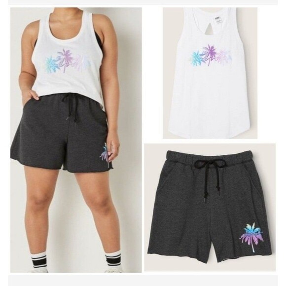 VS PINK OUTFIT PALM TREE SHINE SET TROPICAL L dad shorts tank