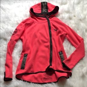 This one was super spendy when I first purchased it. Limited edition. It has a sequin logo on the front and down the back, reflective hood logo and embroidered logo on right sleeve. The sweatshirt features thumb holes, Mesh inside of the hood, a high neck to keep you warm and a high/low hem line. Zero flaws, worn only once. Hot pink, very slight tinge of orange. Secure pockets zip shut.