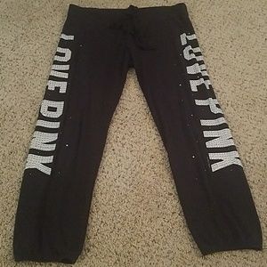 Absolutely gorgeous VS PINK rhinestone hoodie and pant set. Full zip hoodie with pockets size medium. Signature crop pants with drawstring size large. Rhinestones galore! Perfect condition. Comes from a smoke free home.