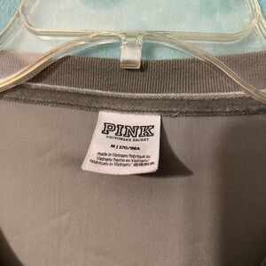 Sage, olive green color. Crew neck line. All over velour, velvet material. PINK logo on front. Slightly Cropped length. Short sleeves. Loose fit.