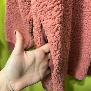 Oversized fit. Cozy soft Sherpa material. Hooded. Half zip. Color block half light pink, half dark print.