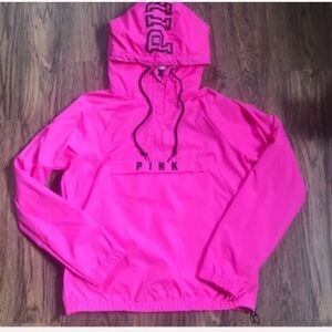Pink quarter zip jacket is lightweight, relaxed fit, has pocket on front, zippers on sides and has ties to tighten hood. Sherpa lining in hood only. Water resistant.
