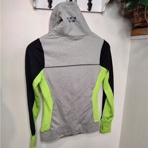 VS PINK Ultimate High Neck Pullover Gray Neon Green Color Block Sweater Size XS. Gray, neon green/yellow & black colorblock coloring. Signature pink branding/logo on the chest. Large kangaroo pocket on the front with the option to zip them closed; concealed zippers on either side/end. Long sleeves with thumbholes. Pullover styling; no closures.