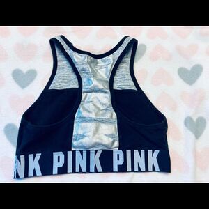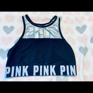Victorias Secret PINK Unlined Sports Bra Logo Crop Top XS. Lots of shimmer and logo detail.