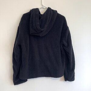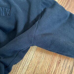 - solid black with black embroidered "PINK" spellout on chest on one side / solid black sherpa teddy bear fleece on other side