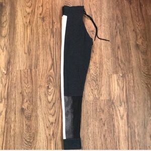 Super soft yoga campus leggings in black & pink. Mesh detail on front bottom. Materials are 52% cotton/35% polyester/13% elastane. Measures approximately 12" across waist & 28" inseam.