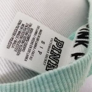PINK Victoria's Secret pullover sweatshirt. Lightweight material in a pretty aqua / mint green color. Accented with black mesh side panels. White and an iridescent oilslick black logo design on the front and back. Ribbed cuffs and collar. Size small.